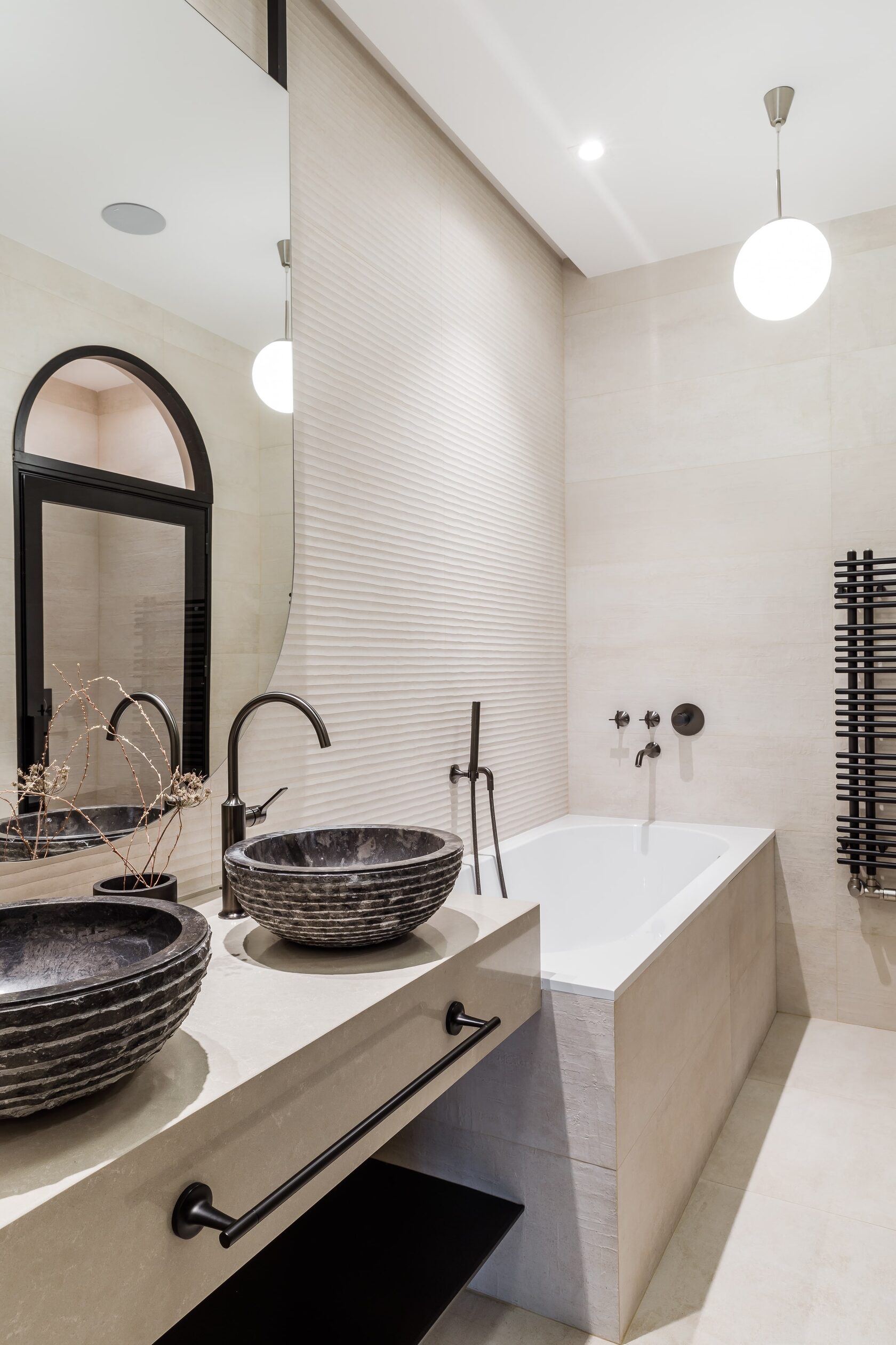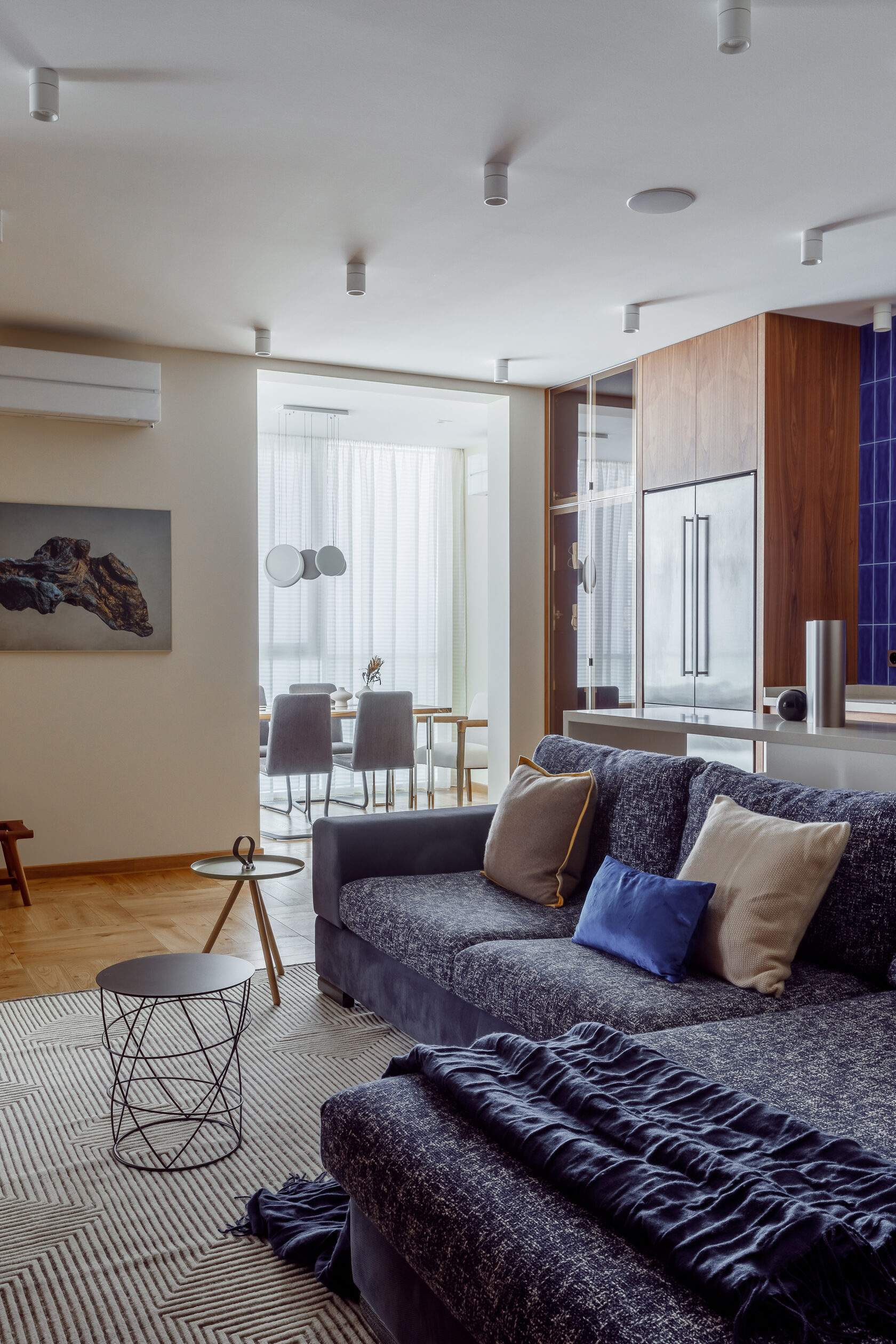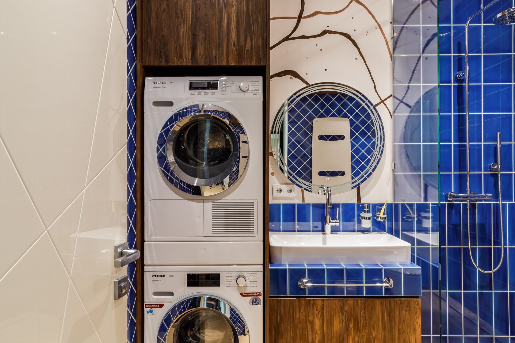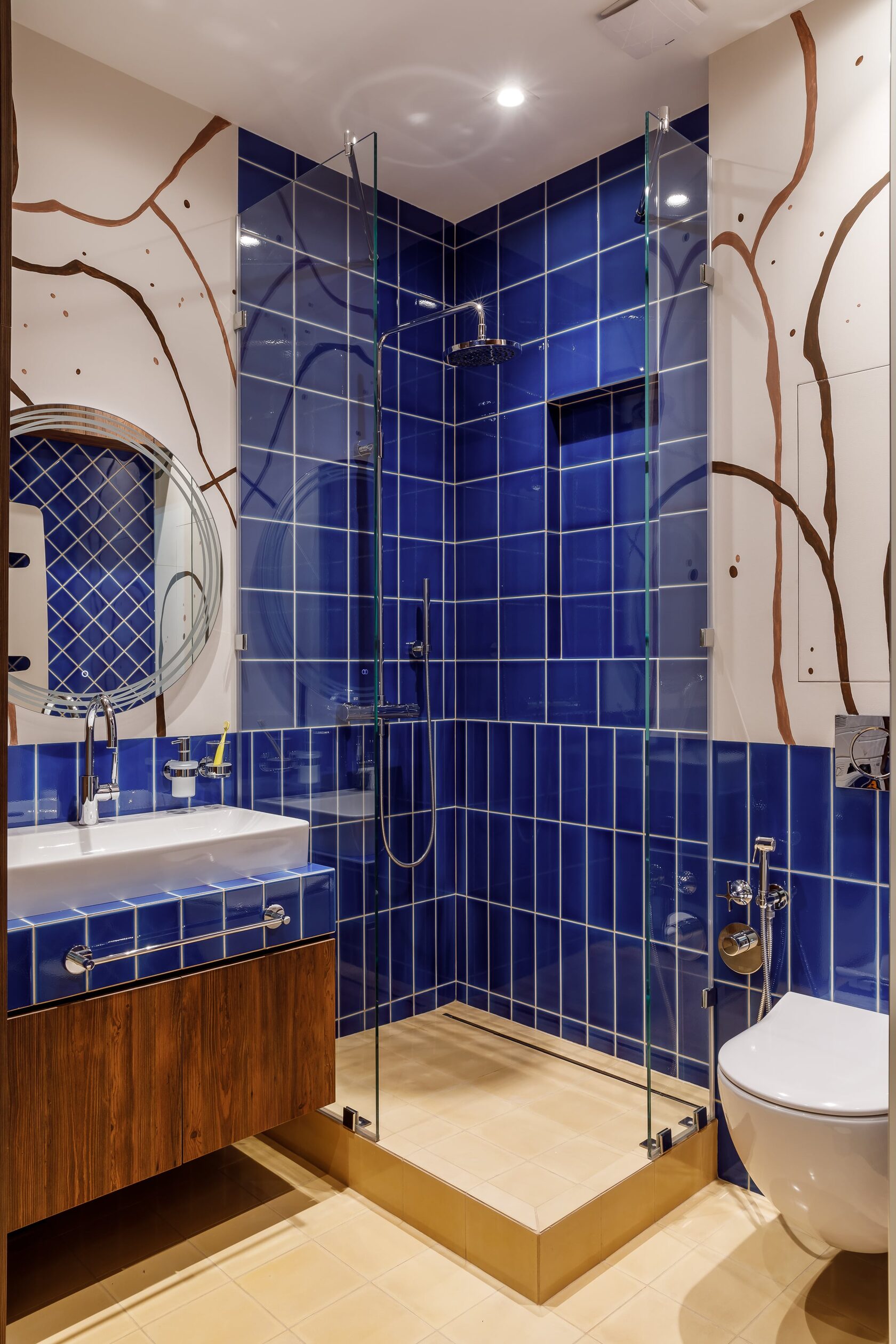 Любимым синим цветом Хозяина квартиры оказался ультрамарин. Поэтому я использовала плитку в цвете «ультрамарин» в нескольких помещениях.