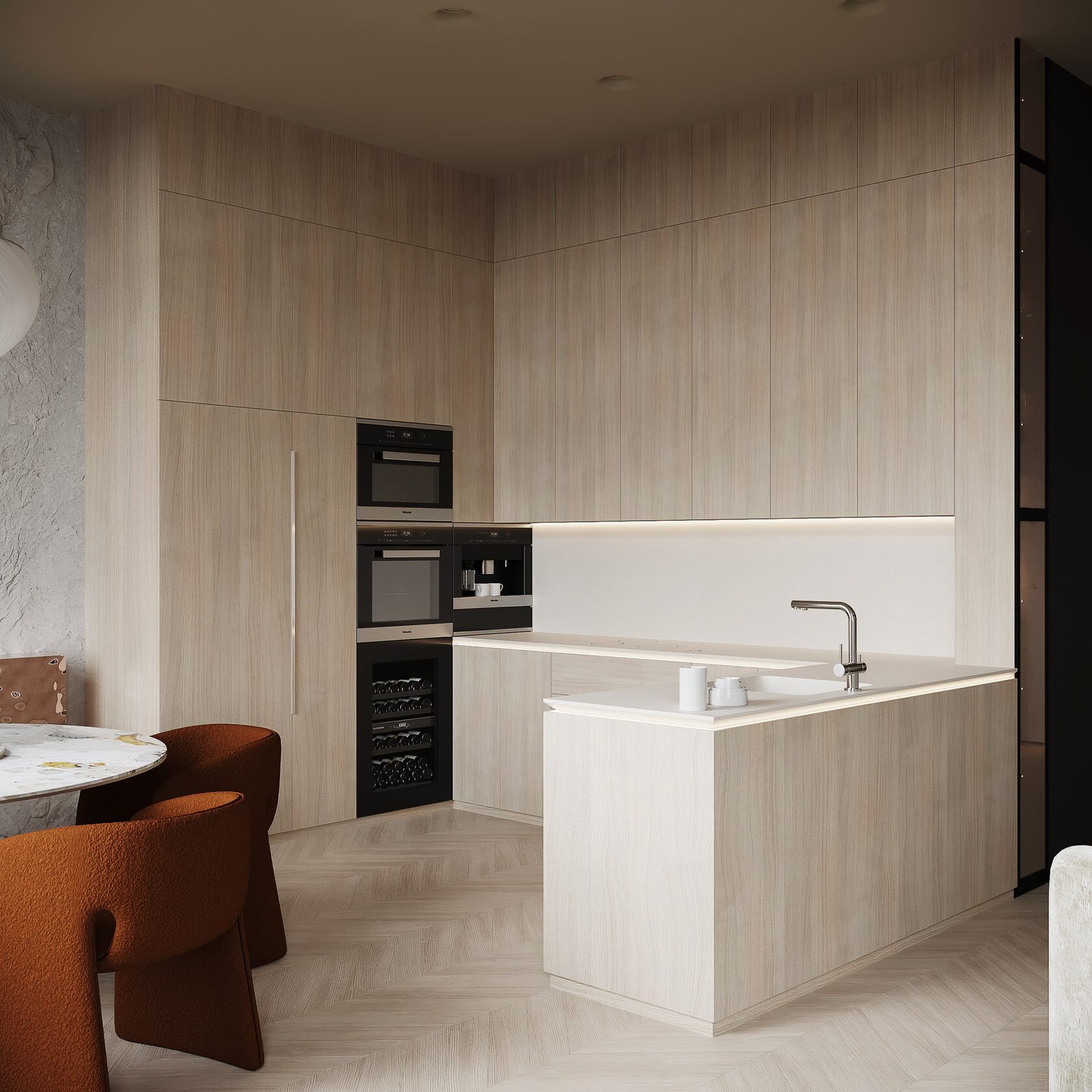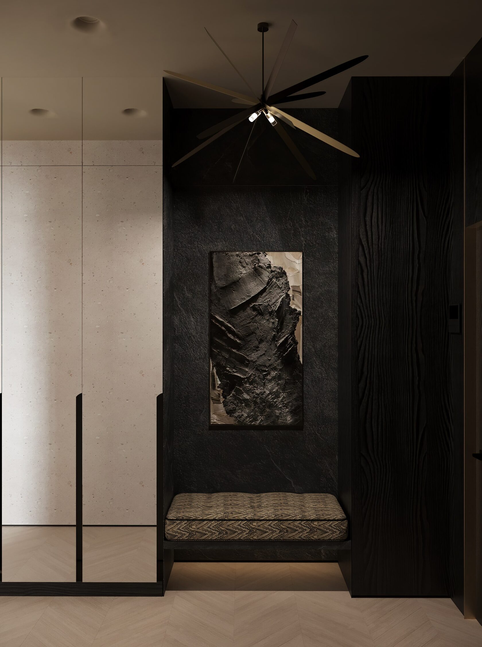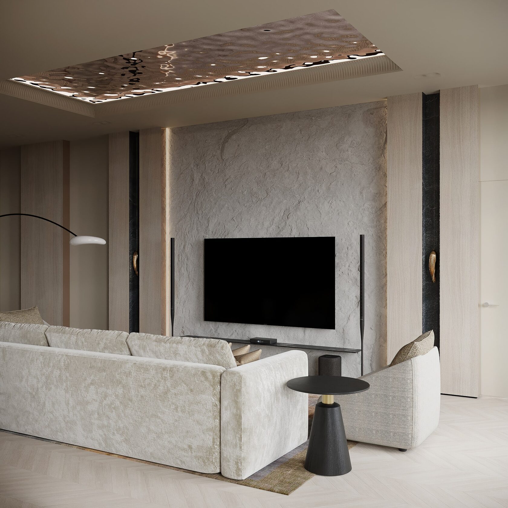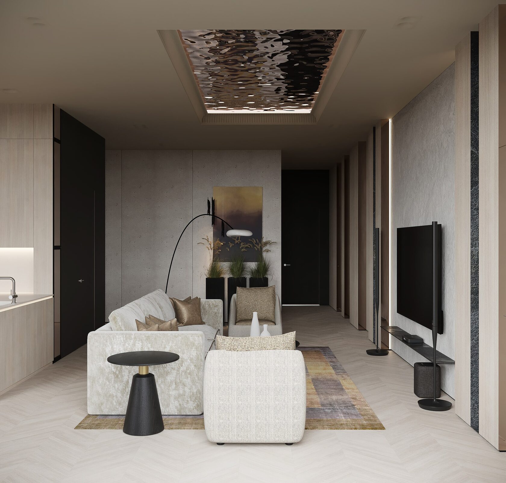 При создании концепции дизайна квартиры я была вдохновлена своей последней поездкой в Египет. Передать контраст жаркого солнца и стихии воды удалось с помощью холодного сверкающего металла в отделке и элемента огня - камина в обеденной зоне.