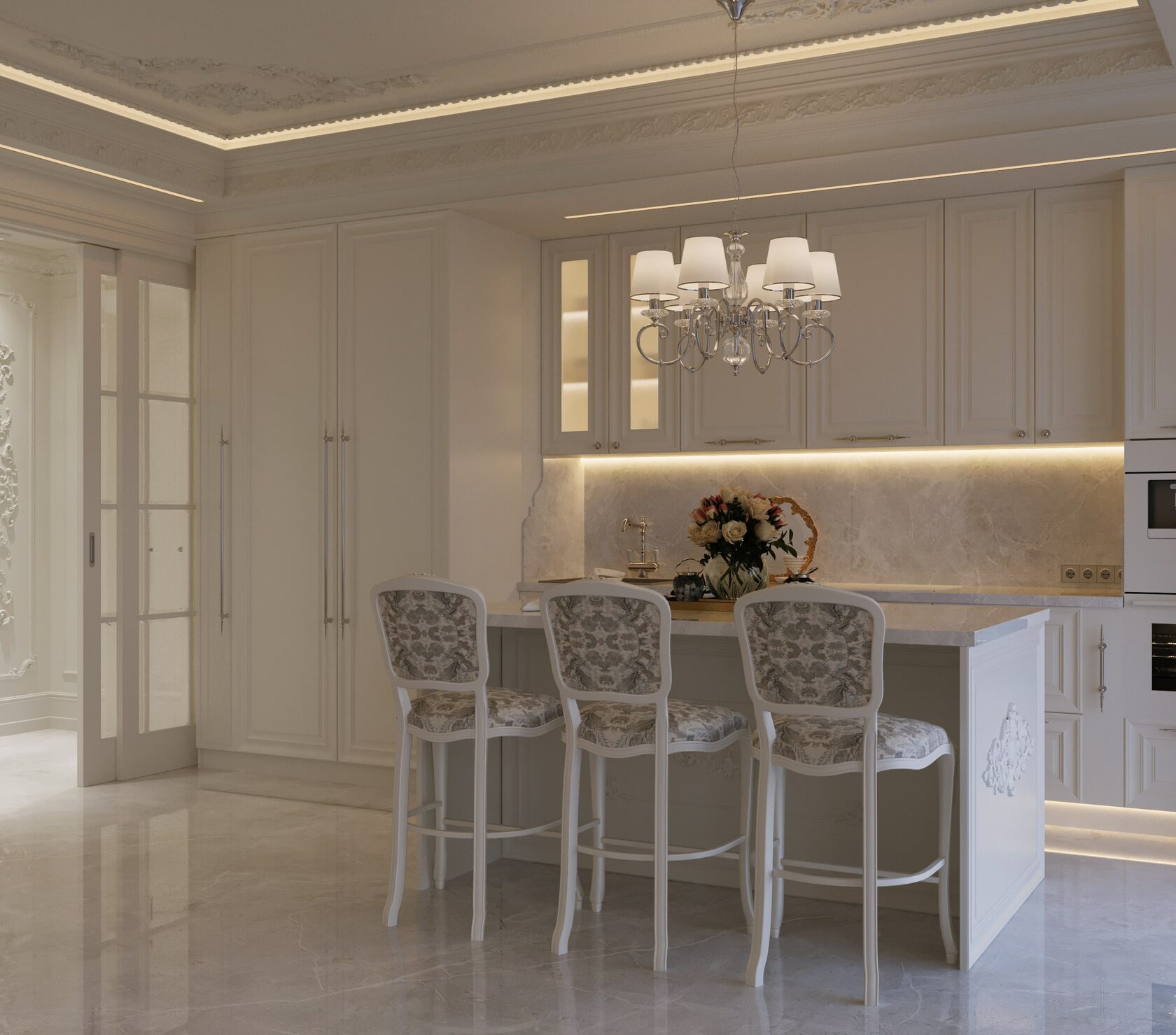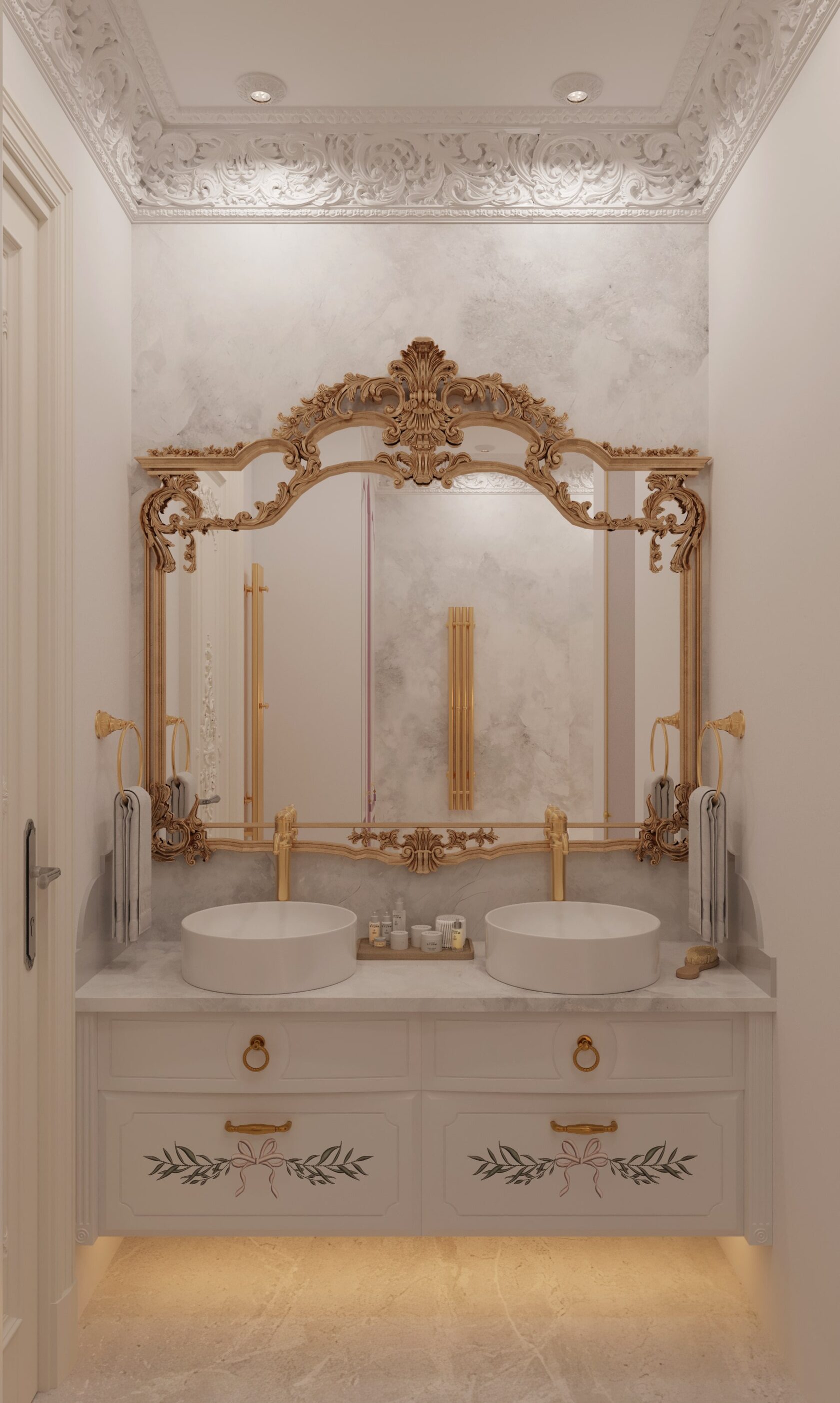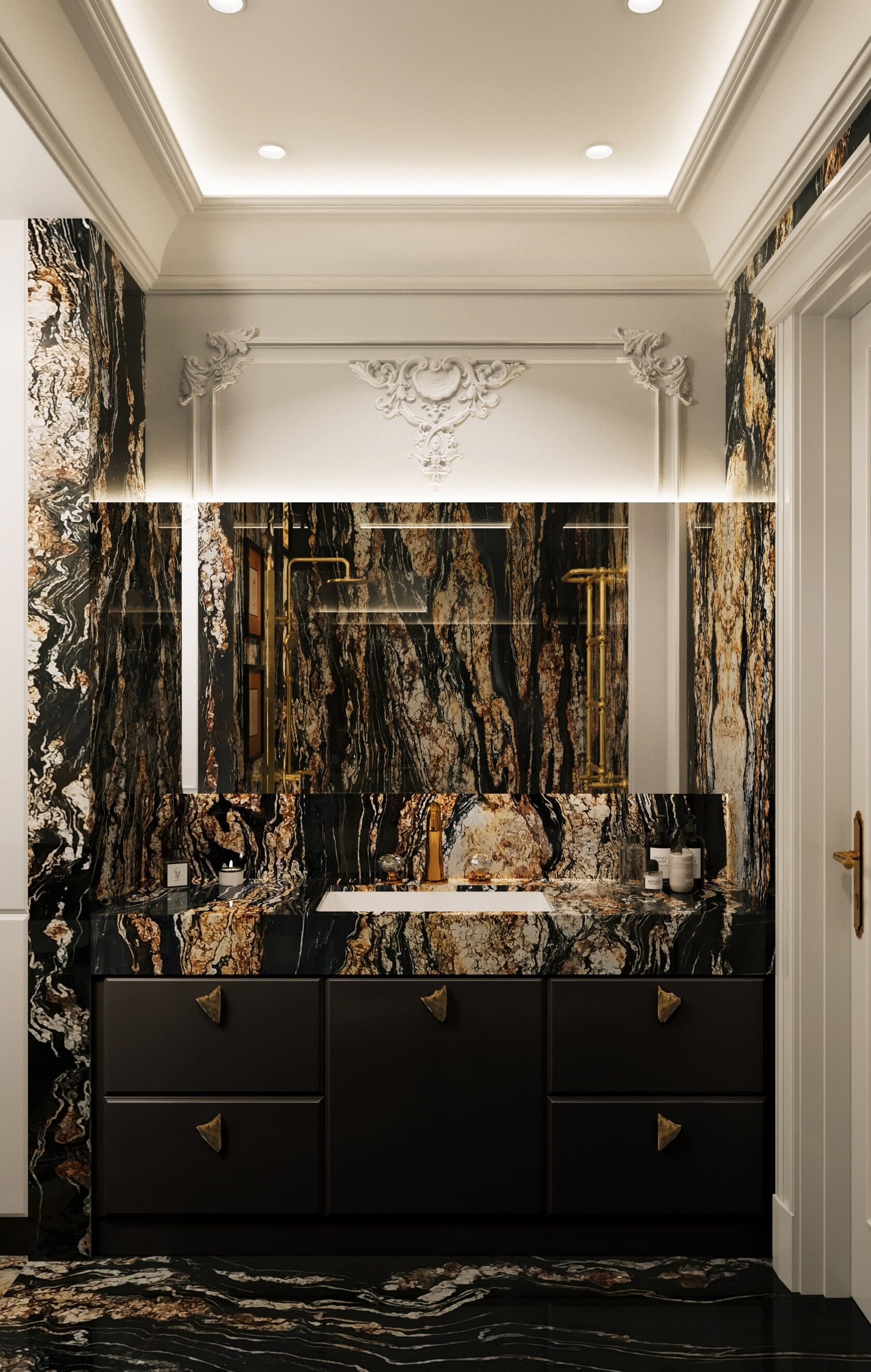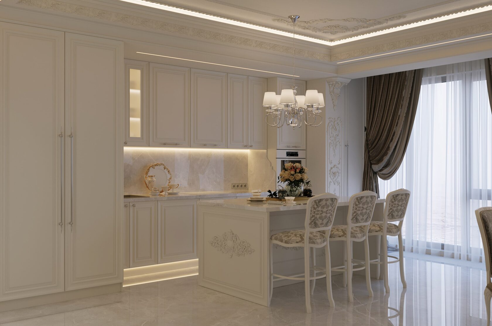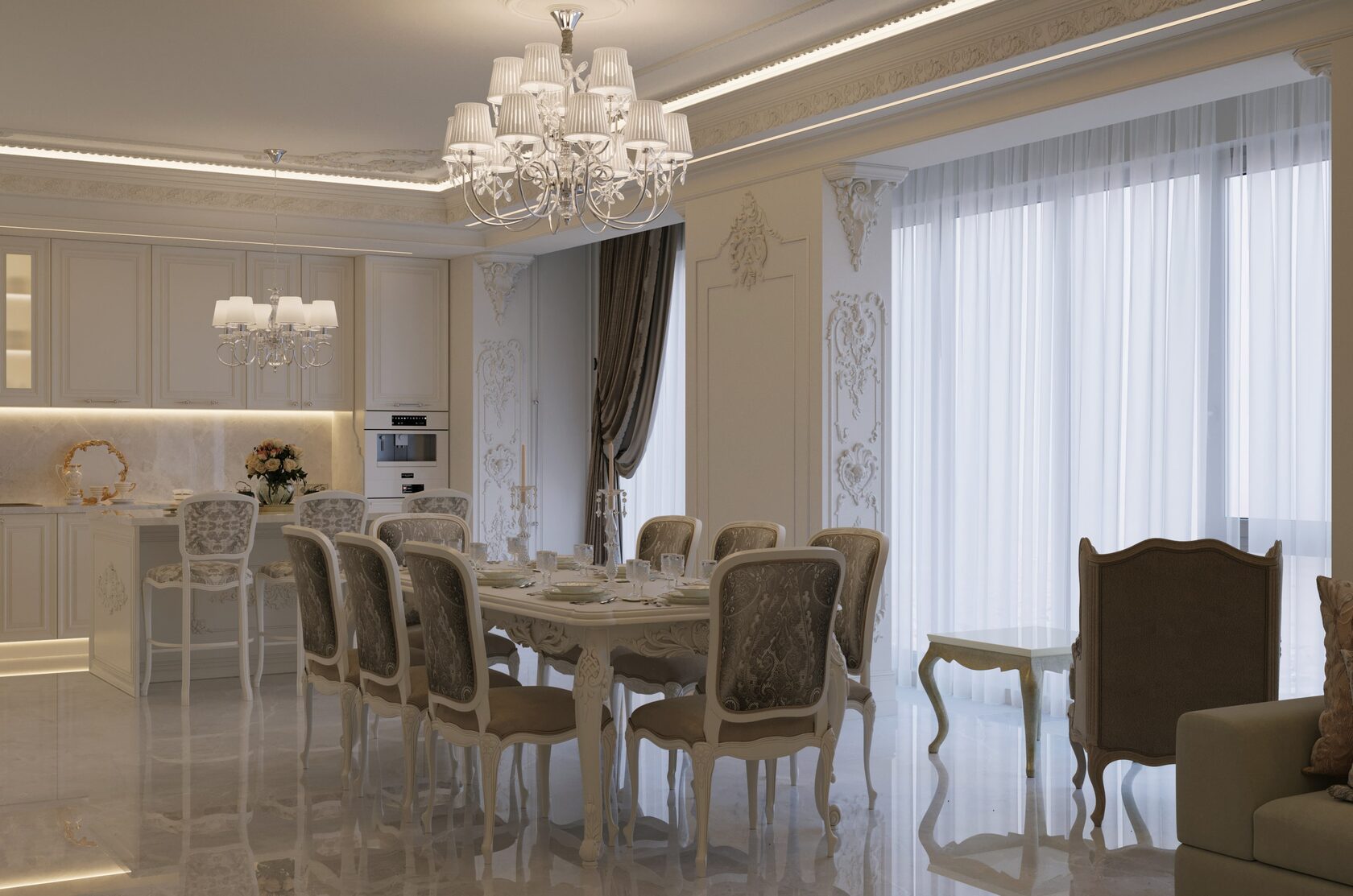 Внешний облик отображает современное прочтение исторических стилей: Классицизм- Прованс-Рококо. Эти стили характеризуют обильная лепнина на стенах и потолке, орнаменты на полах, использование натурального камня в отделке, резных элементов на фасадах мебели.
