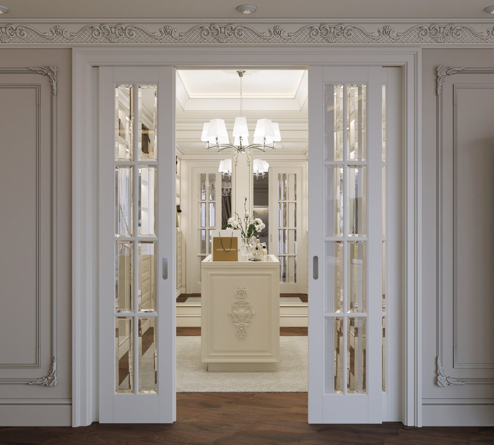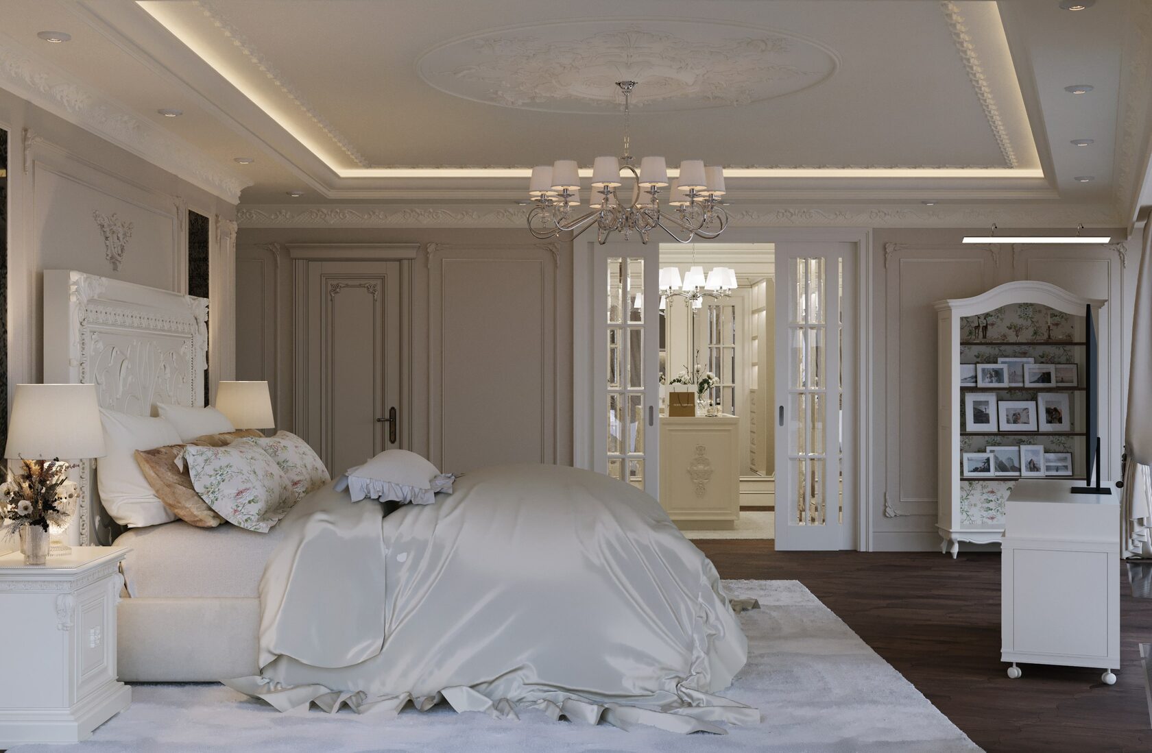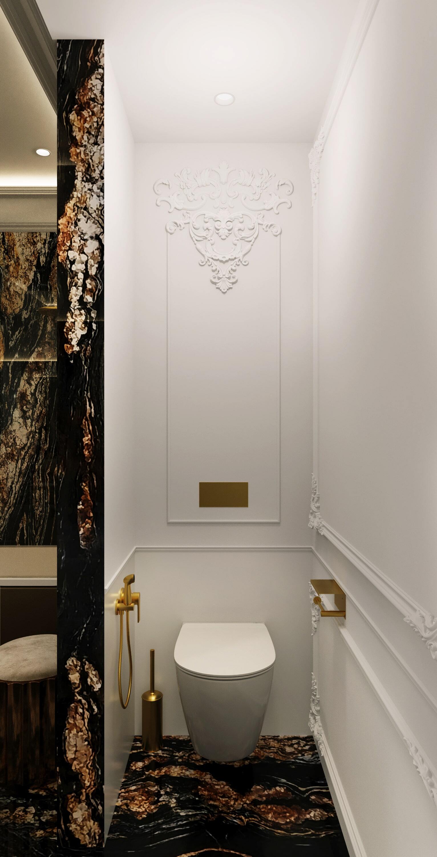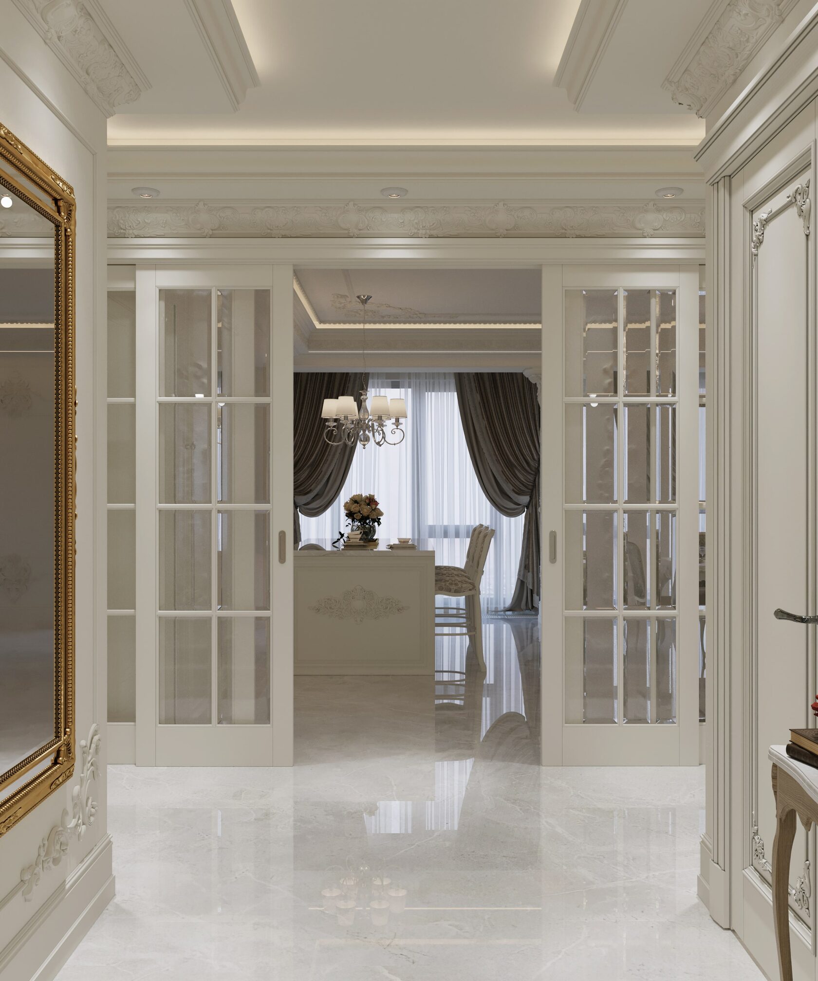 Внешний облик отображает современное прочтение исторических стилей: Классицизм- Прованс-Рококо. Эти стили характеризуют обильная лепнина на стенах и потолке, орнаменты на полах, использование натурального камня в отделке, резных элементов на фасадах мебели.