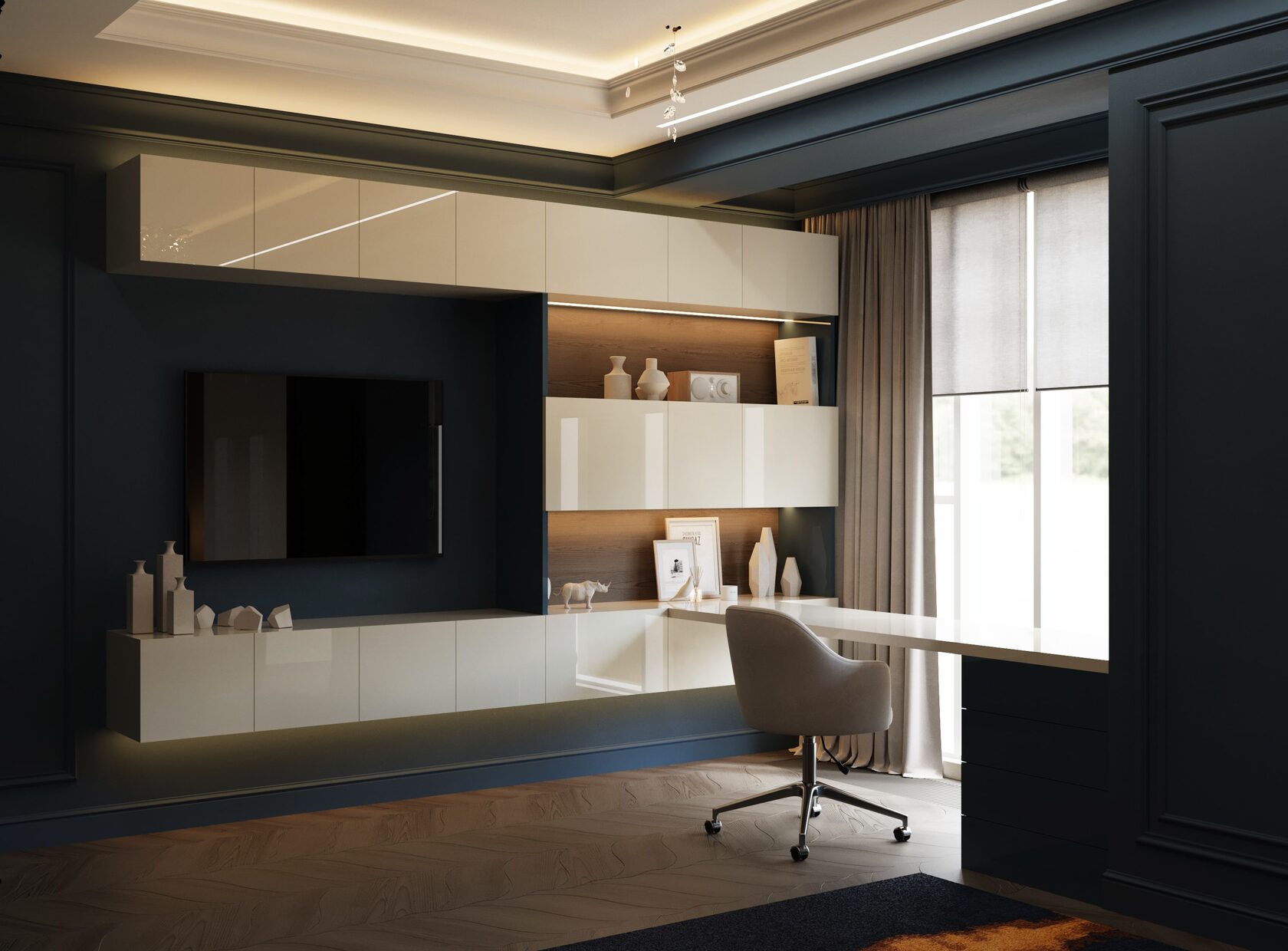 Мастер-блок включает в себя: хозяйскую спальню, ванную, гардеробную и небольшой кабинет.