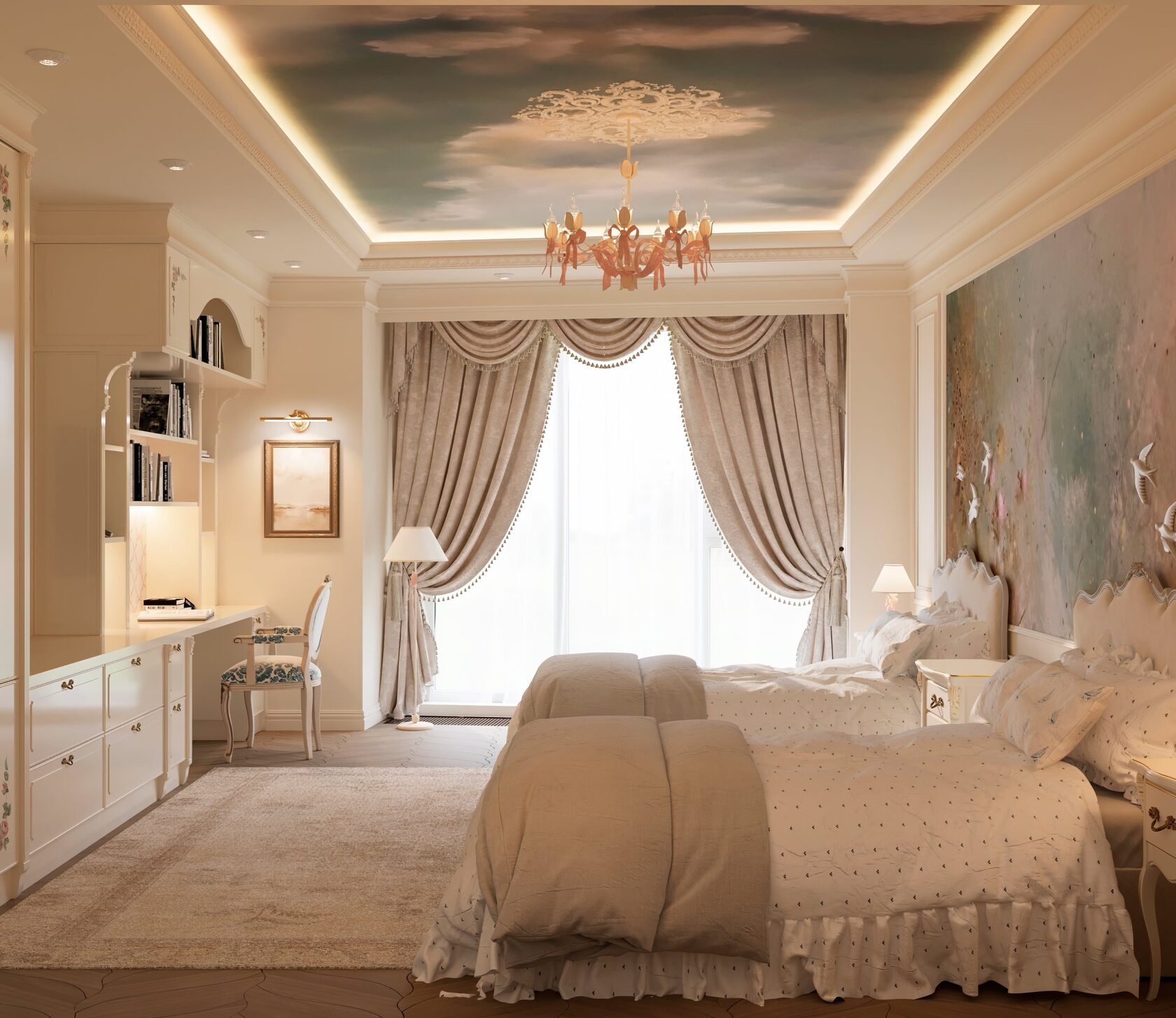 Девочкам принадлежат две спальни и своя ванная. Пока девочки маленькие, они будут жить в одной спальне вместе, а вторая спальня будет служить игровой комнатой. Когда девочки подрастут, оби комнаты станут их раздельными спальнями. В проект заложены все сценарии будущей перестановки с точки зрения инженерных сетей.