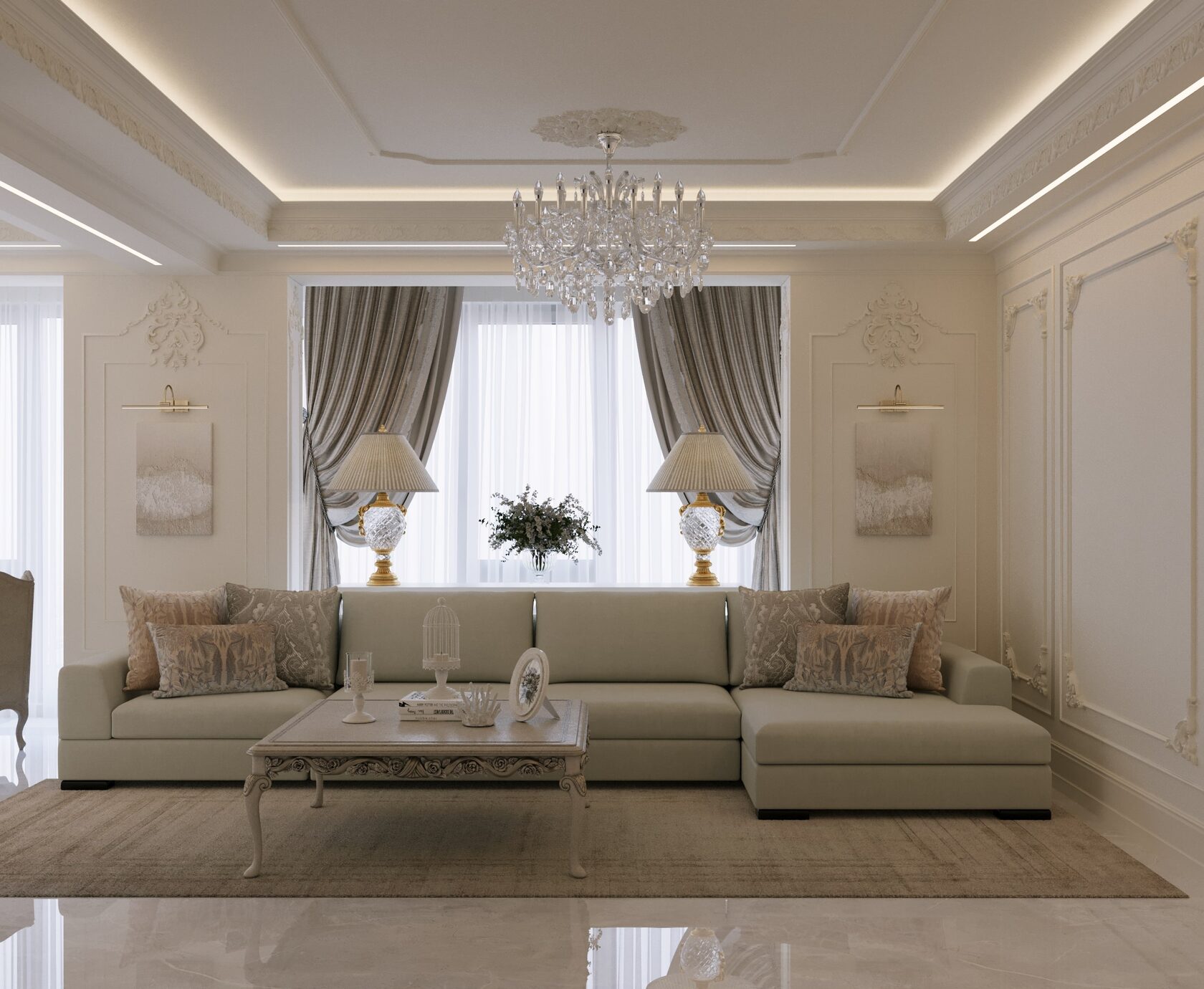 Вдоль панорамного остекления через анфиладу залов открывается вид на гостиную зону с 4-метровым диваном и ТВ зоной. Преобладает светло-бежевая/кремовая палитра, которая наполнит и без того просторные помещения кухни-гостиной-обеденной и спальни светом и воздухом. Умеренное присутствие стекла, хрусталиков на люстрах и глянцевых поверхностей придадут помещениям лоск.